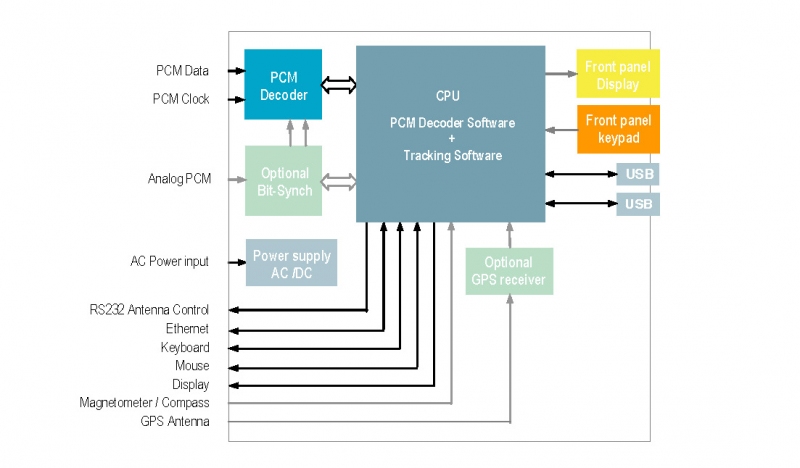 Main Features • Embedded IRIG 106 PCM Decoder. • Real-time tracking calculation with trajectory interpolation. • Real-time display of tracking parameters. • Local or remote configuration. • Optional internal Bit-Synchronizer. • Optional GPS/Magnetometer for local reference. |