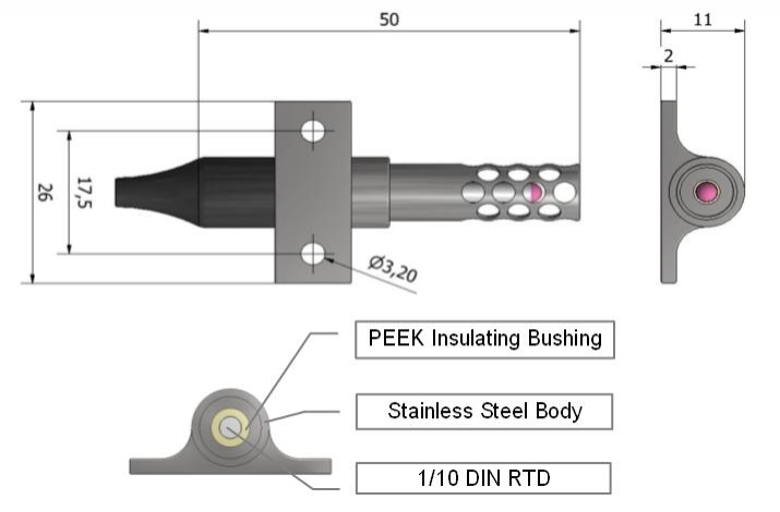 Stainless Steel body with ceramic RTD thermally isolated by a PEEK bushing |