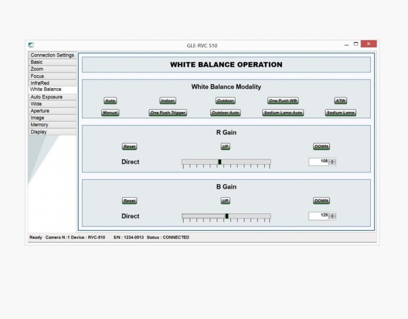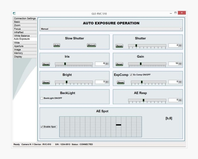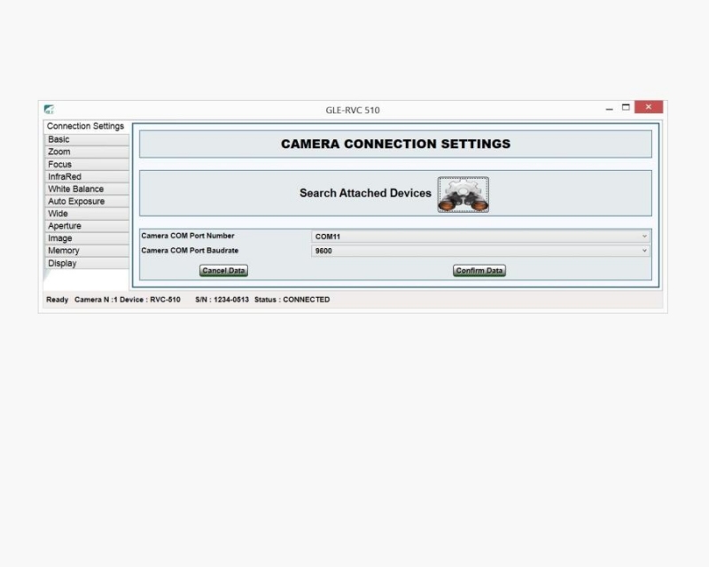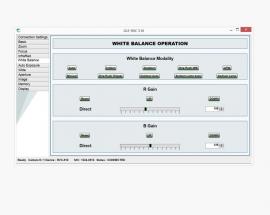 The software GUI for Win XP / 7 / 8 allows the easy setup of all camera functions via RS232, it provides the following sections: Connection settings, Basic-Setup, Zoom, Focus, Infrared, White balance, Auto Exposure; Wide, Aperture, Image, Memory, Display titles.
