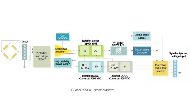 gle/SG-IsoCond-01 is a highly accurate and cost-effective signal conditioner for single-channel strain gages and Wheatstone bridges in general like load cells and pressure transducers. The module accepts 350 Ohm (or greater) full-bridge gages providing the appropriate bridge excitation, signal filtering and conversion to a high level voltage output. Moreover gle/SG-IsoCond-01 has been designed to perform reliable internal isolation: voltages up to 2100 VDC (equivalent to 1500 Vrms) can drop between the input and the output stages of the conditioner (see the block diagram reported below).