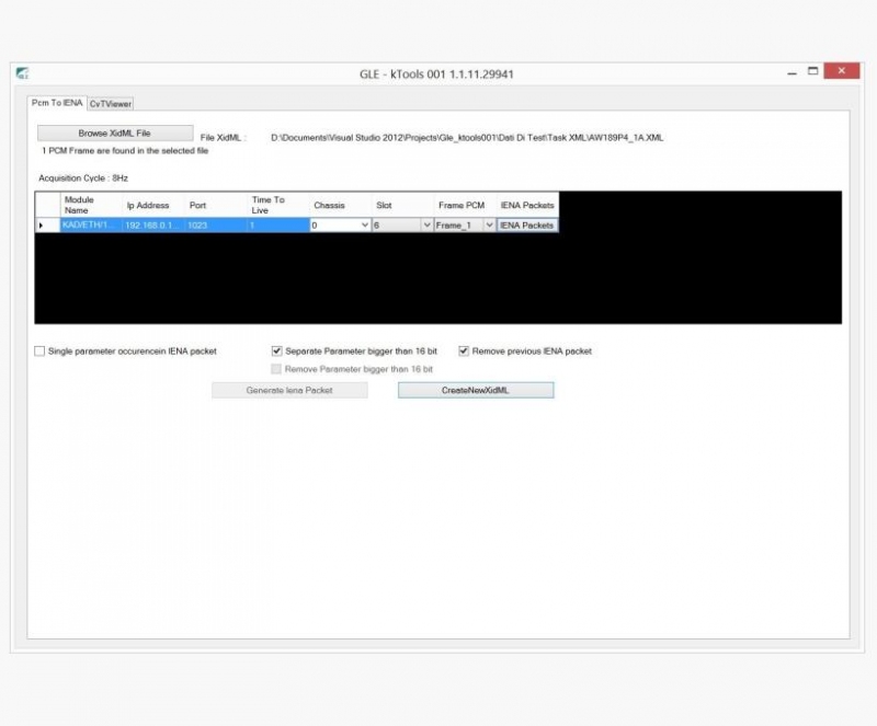 Ethernet IENA(**) data stream may optionally be decoded and visualized directly. In this case gle/kTools offers the capability to automatically build the IENA packets configuration starting from a PCM frame defined with the XidML schema.